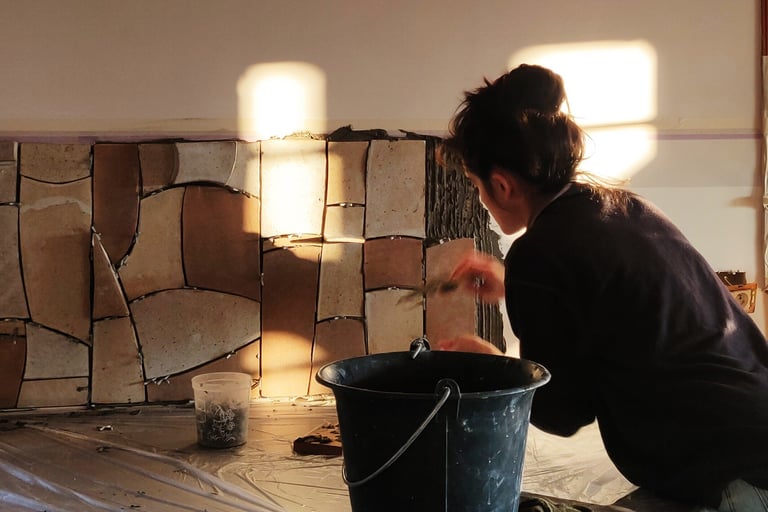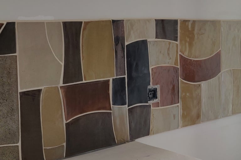 Fabrication d’un socle de cheminée carrelé, en terre noire (Thierry Doublet) et terre de la carrière de Dax vitrifiée.